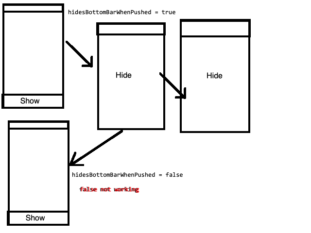 我认为只有当您在堆栈上推送一个hidesBottomBarWhenPushed时,viewController才能工作。当您返回到您的initialViewController时,实际上是回过头来,而不是在导航堆栈中向前推进。