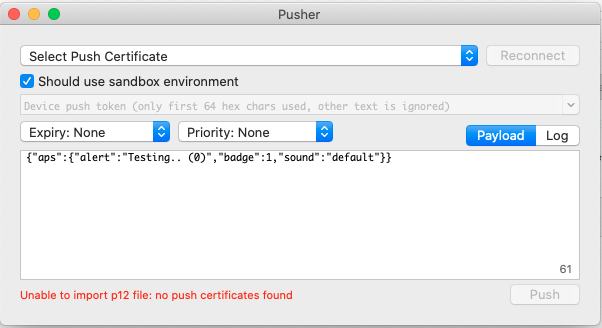 我试图使用推送通知调试工具,发现它需要导入证书。我导出了企业概要文件的p12文件。在Xcode中,我可以看到在这个企业配置文件下启用了推送通知。但是,当我导入这个调试器工具时,我面临的问题是没有找到推送证书。此“推送证书”与启用推送通知的分发证书不同吗?