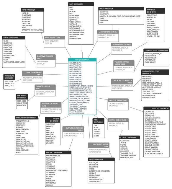 我正在为临床数据集( 模拟-III )设计一个模式。我试图找出一种方法来存储事件,以便用户可以使用可能的星型模式轻松地查询数据集。几乎所有的条目,如诊断、程序、记录、图表等,都与一次入院有关。我有一些想法,但我没有经验,所以我发现很难找到最好的方法来做这件事。