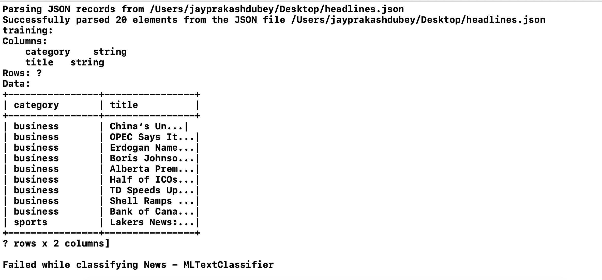 if let objNewsClassifier = try? MLTextClassifier(trainingData: training, textColumn: "title", labelColumn: "category") {