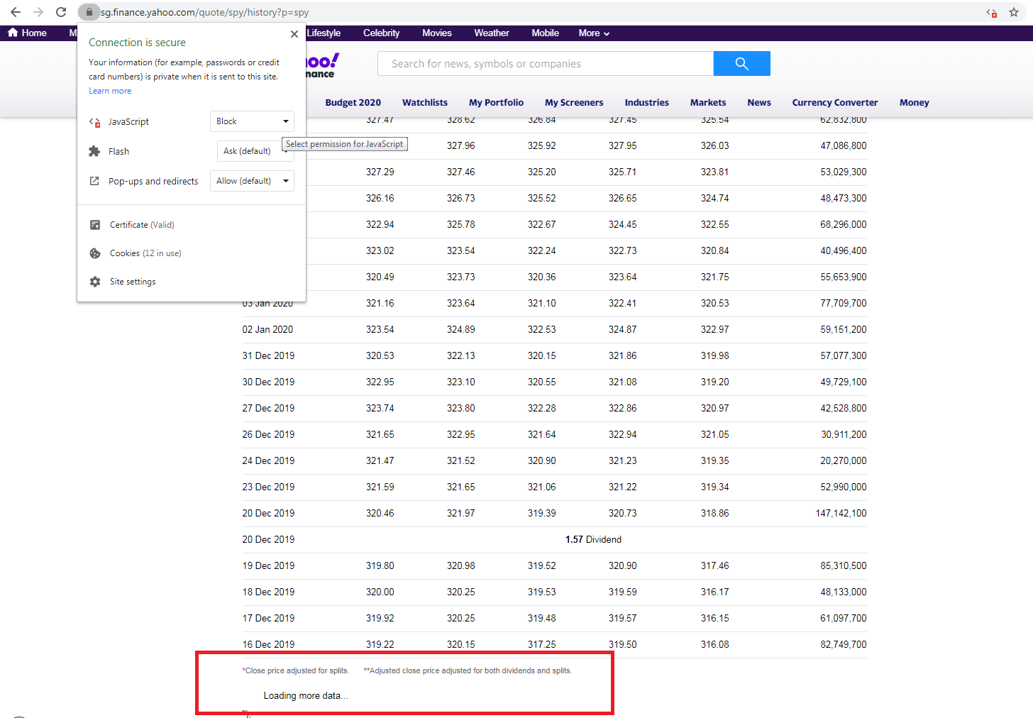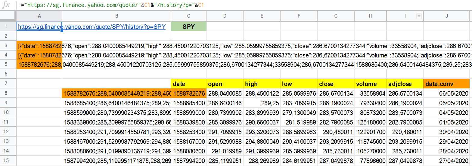 =ImportXML("https://sg.finance.yahoo.com/quote/"&B57&"/history?p="&B57, "//tbody/tr[21]/td[6]")例如,单元格B57是"SPY"。