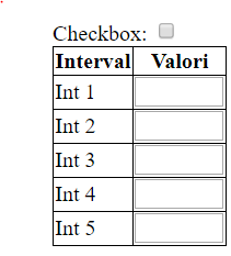document.getElementsByName表中有6个元素,包括第一个tr <tr>th>Interval</th><th>Valori</th></tr>,因此您需要从i = 1;开始,而不是从i = 1;返回一个NodeList元素。元素的NodeList没有.value属性。因此,在访问索引[0]之前,必须使用索引[0]。