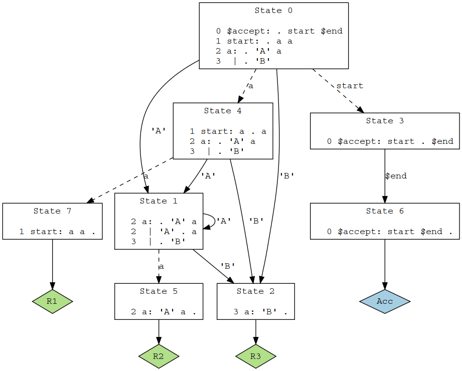 我不知道解析器生成器是做什么的,但是标准的解析器生成器在语法方面没有问题。例如,这里是bison的状态转换表,它是用以下方法生成的: