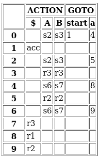 CONTINUING WITH CLR(1)...这些状态与我在其他资源中可以看到的编译LALR语法的内容相匹配--这个步骤看起来没问题,它会产生正确的状态,就像我手工完成它一样。生成器建议--同样是其他消息来源所说的将CLR(1)语法转换为LALR --声明可以加入(2,6)、(3,7)、(5,9),但它无法这样做。当我查看生成的动作和goto表时,我可以看出为什么: