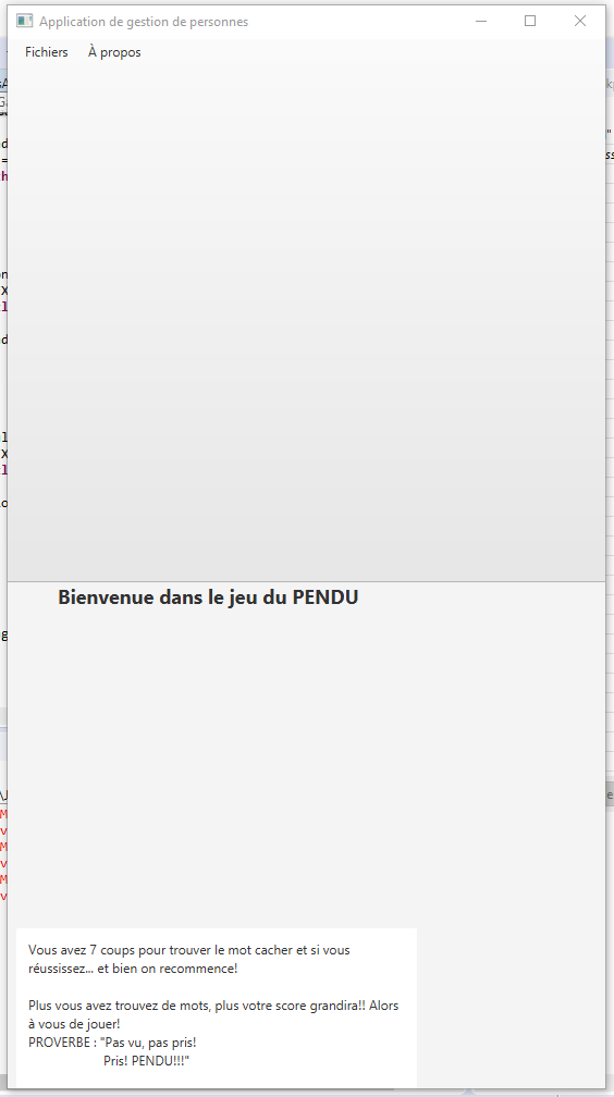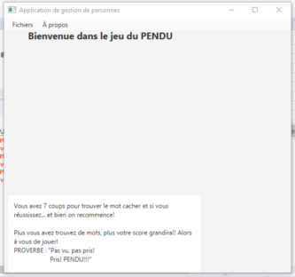 text="Vous avez 7 coups pour trouver le mot cacher et si vous réussissez... et bien on recommence! Plus vous avez trouvez de mots, plus votre score grandira!! Alors à vous de jouer! PROVERBE : "Pas vu, pas pris! Pris! PENDU!!!"" wrapText="true" />