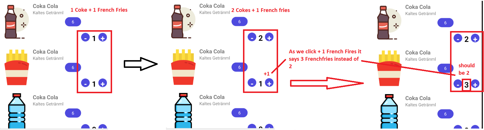 我有个问题。这两个按钮(+和-)具有相同的计数器。例如,当我增加可乐(假设我们想要两杯可乐)时,我按了两次按钮,一切正常,但只要我想要薯条(除了两杯可乐外,还有一份薯条),薯条的柜台就会增加到3,而应该是1,因为我第一次点击了它。下图显示了这个问题。