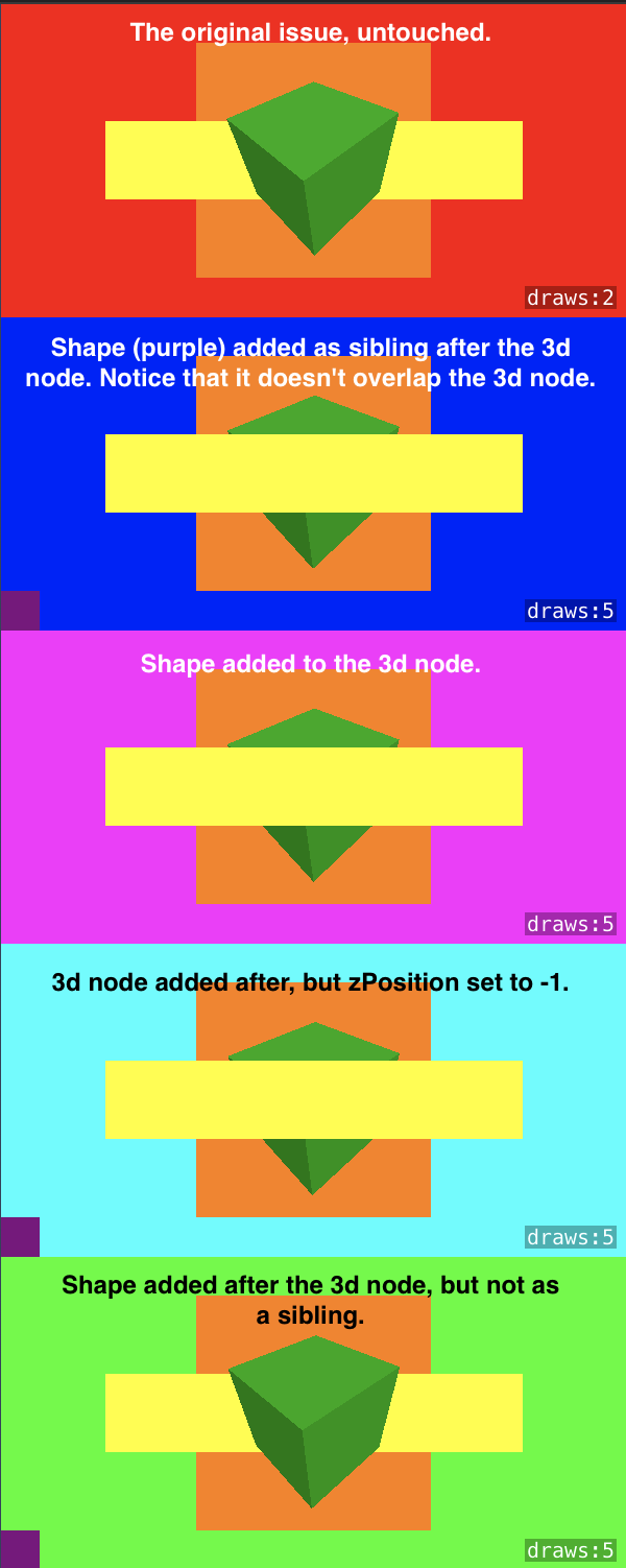 似乎有一个SKShapeNode (带一个填充)与一个SK3DNode (或者作为一个兄弟,一个兄弟树的一部分,或者一个子)按照正确的顺序绘制它。SKShapeNode似乎也不需要与SK3DNode交叉。