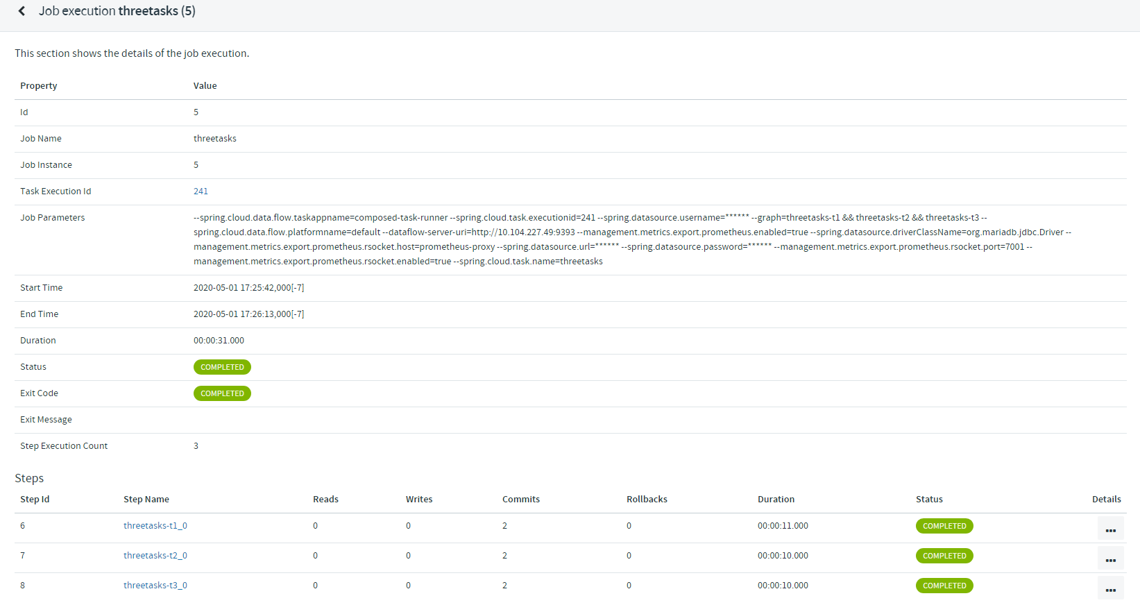 Caused by: org.springframework.batch.core.repository.JobInstanceAlreadyCompleteException: A job instance already exists and is complete for parameters={-spring.cloud.data.flow.taskappname=composed-task-runner, -spring.cloud.task.executionid=246, -graph=threetasks-t1 && threetasks-t2 && threetasks-t3, -spring.datasource.username=root, -spring.cloud.data.flow.platformname=default, -dataflow-server-uri=http://10.104.227.49:9393, -management.metrics.export.prometheus.enabled=true, -management.metrics.export.prometheus.rsocket.host=prometheus-proxy, -spring.datasource.url=jdbc:mysql://10.110.89.91:3306/mysql, -spring.datasource.driverClassName=org.mariadb.jdbc.Driver, -spring.datasource.password=manager, -management.metrics.export.prometheus.rsocket.port=7001, -management.metrics.export.prometheus.rsocket.enabled=true, -spring.cloud.task.name=threetasks}. If you want to run this job again, change the parameters.