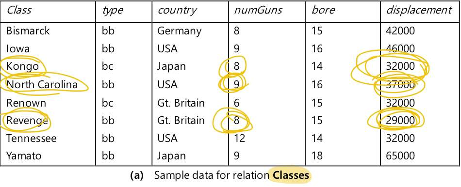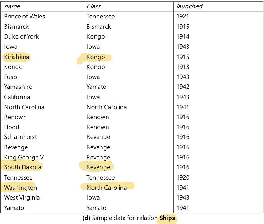 您希望显示两个表的数据:ships和classes --它们与1:n相关,所以只需加入它们(inner join on / using)即可。那么你就有条件只考虑在某一次战斗中出动的船只。条件在理想情况下属于WHERE子句。我们使用EXISTS或IN在其他表中查找数据。