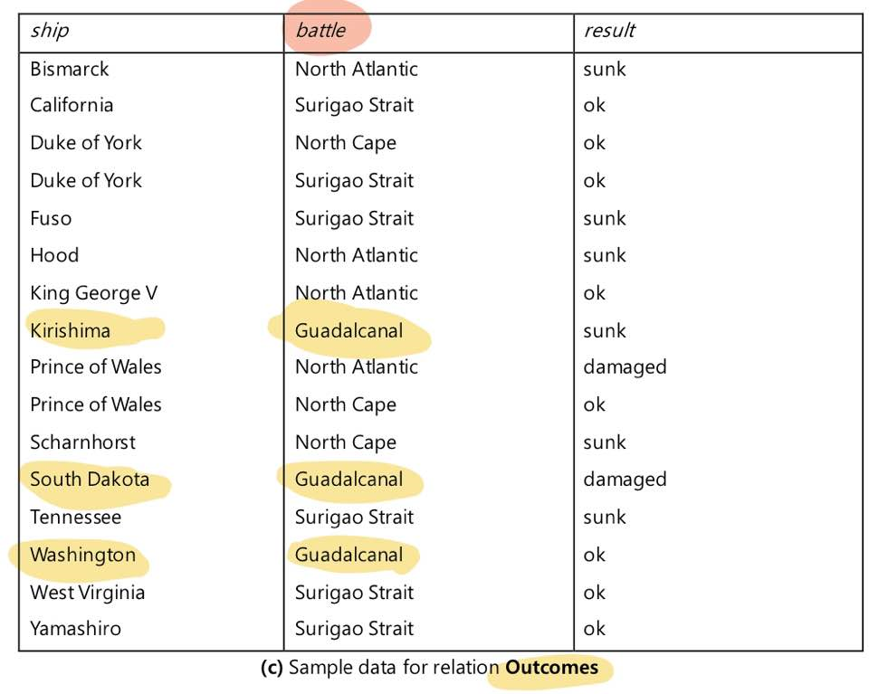 order by s.name;通过在WHERE子句中添加条件,我们避免了任何重复。嗯,在这种情况下(只有一场战斗),我们无论如何也不会得到重复的,但是考虑看多场战斗。一次加入会使我们的船多倍,就像一次加入
