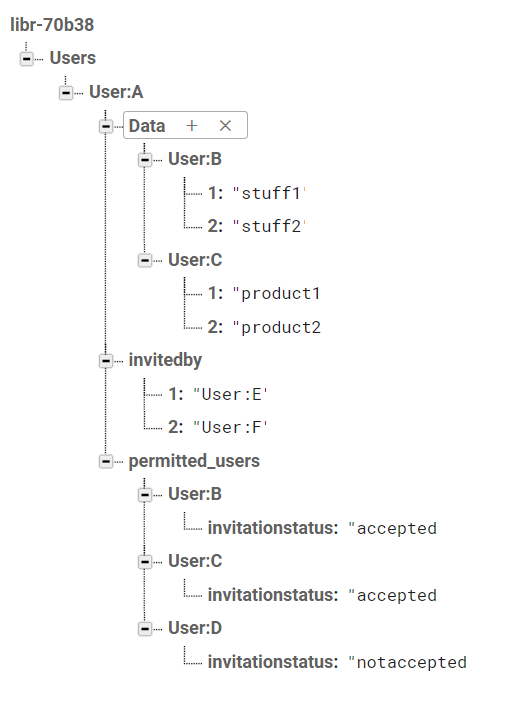 这个应用程序的每个特定用户在其实时数据库中都有3个子节点。在这3个节点中,其中一个节点(例如用户A)中的数据可由其他一些用户(例如用户B、C)查看+编辑;这2个用户已经被用户A添加到他的列表中,他们可以将共享的DB信息添加到他的列表中。