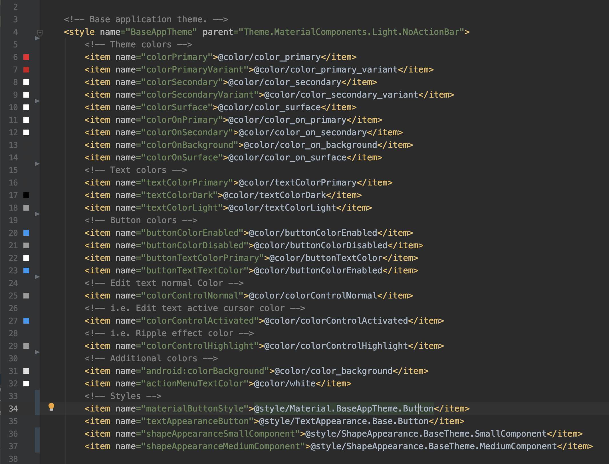 ...> 它仍然显示为默认按钮。因此,我必须删除基本主题中的全局按钮样式,并在每个主题中添加样式。我不知道这是为不同类型的材料按钮应用样式的唯一方法吗?或者我遗漏了什么。这是我的主题和风格代码