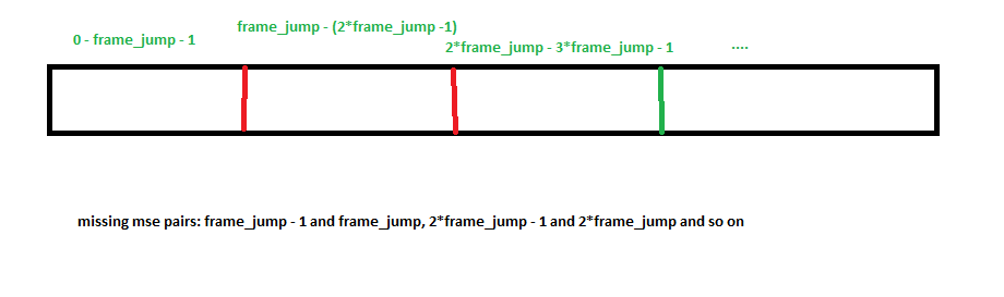我的实现的唯一问题是,对于视频分割的区域,它缺少mse,很容易添加。由于我们可以用O(1)中的OpenCV在任何位置索引单个帧,所以我们可以直接到这些位置分别计算mse并合并到最终的解决方案。检查更新的代码,它修复合并部分
