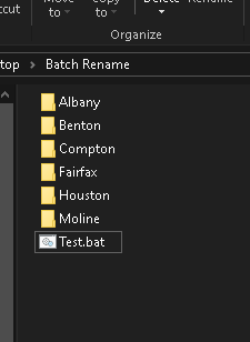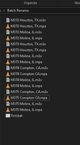 每周,我的一位同事都要翻看一个文件夹,里面有数百的已销毁的视频和音频文件,为特定的城市电视台重新命名,然后根据城市的名称将它们分类。我已经创建了一个.bat文件来为他重命名它们,现在我想创建一个.bat文件,它根据文件名创建新的目录,并将相应的文件放入新的文件夹中。我复制了几个要测试的文件。