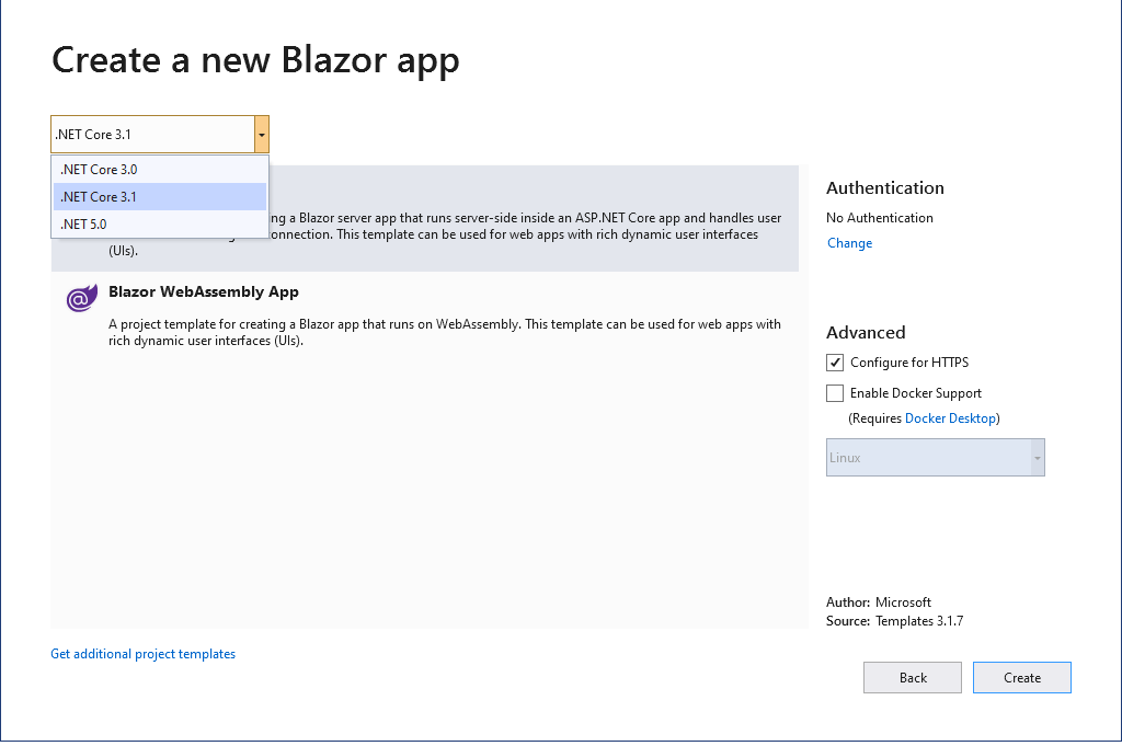 在选择Blazor项目类型(服务器或网络组装步骤)之前,只需在框架 (3.0和3.1)之间切换,菜单将被更新,您将能够看到WASM版本:
