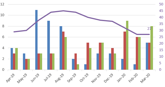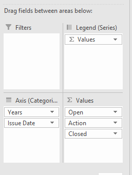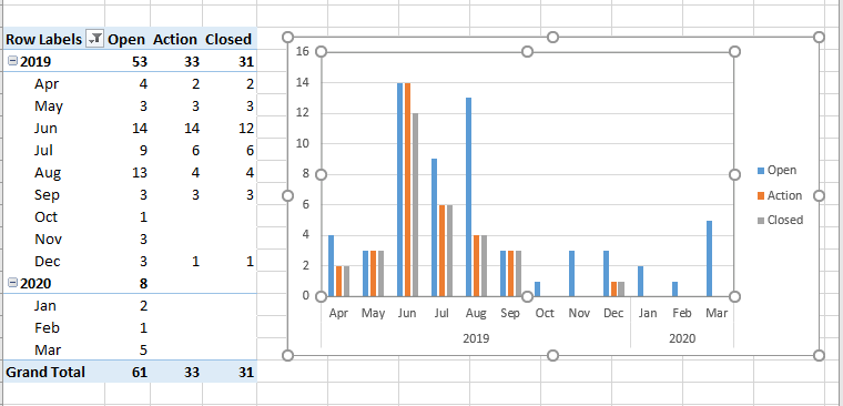 我的目标是在条形图中按月统计三个不同的日期。目前我们正在使用一个计数公式,然后建立上面的图表,希望有一个更干净的解决方案。我有三个专栏,开放,行动,和关闭日期。将这三者加到轴上并不能产生正确的结果。我卡住了。枢轴上有什么我可以改变的吗?我正在通过Power Query把数据拉进来,那里有什么我可以改变的吗?非常感谢:-) Ideal state