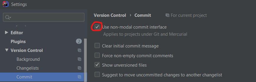 如果“使用非模态提交接口”选项在“文件”的“设置”、“版本控制”、“提交”、“”下启用,则Alt+9将打开带有日志的Git工具窗口,而Ctrl+K将使用“本地更改”和“货架”选项卡打开提交工具窗口。