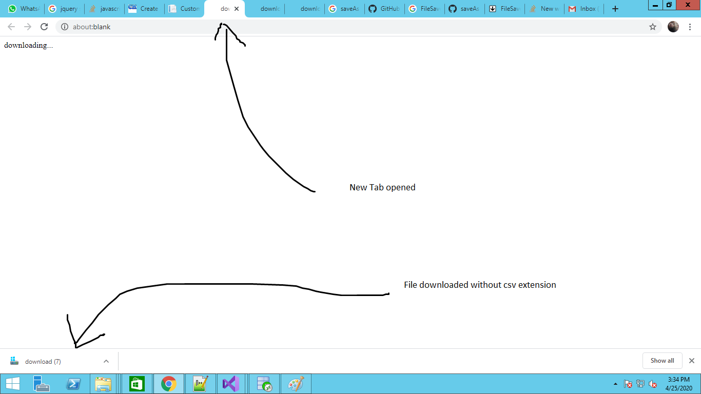 });从按钮单击事件调用此代码。每当代码执行时,就会打开一个新的选项卡,并且保存文件,而不需要csv扩展名。事实上,下载的文件根本没有扩展名。有关详情,请参阅附呈的截图。(7)是由于这是我的第七次下载。