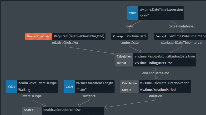[g:AddExerciseResultConcept] i (walked)[v:ExerciseType:Walking] for (2 hr)[v:time.DateTimeExpression] and completed (2 km)[v:measurement.Length]IDE将其显示为的非法计划。