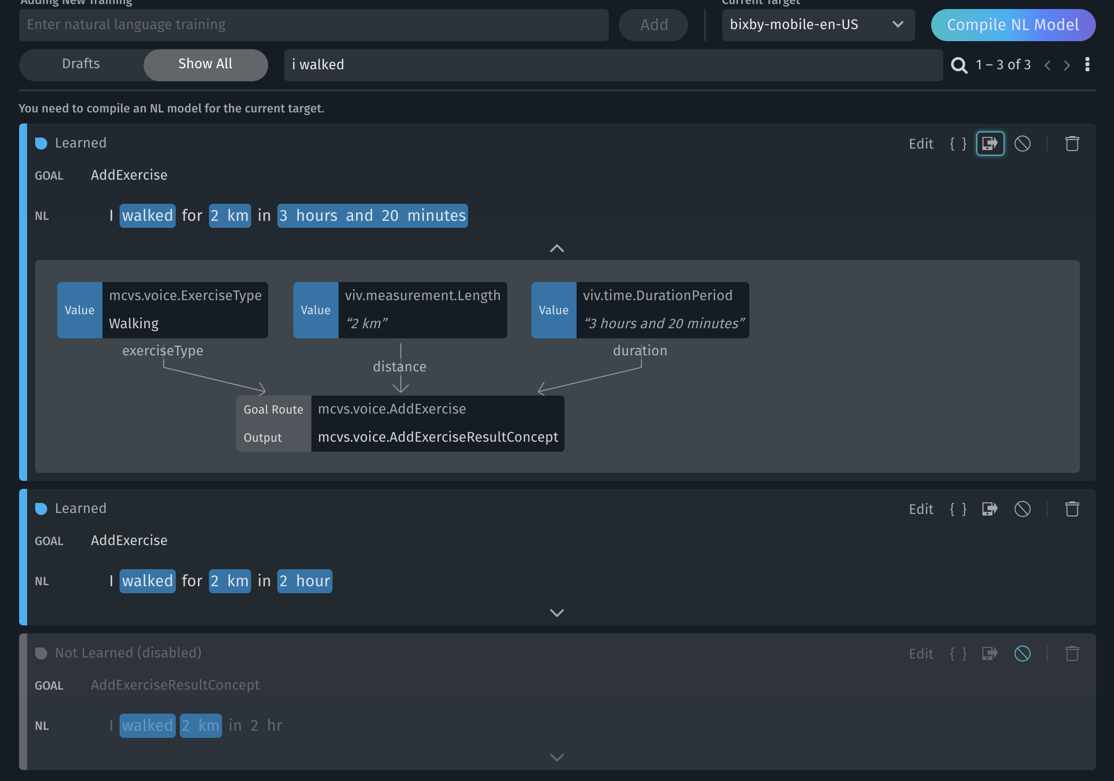 我正在构建一个示例胶囊,在这里我将添加用户活动数据。样本话语为“我步行2小时,完成2公里”。培训源代码如下所示