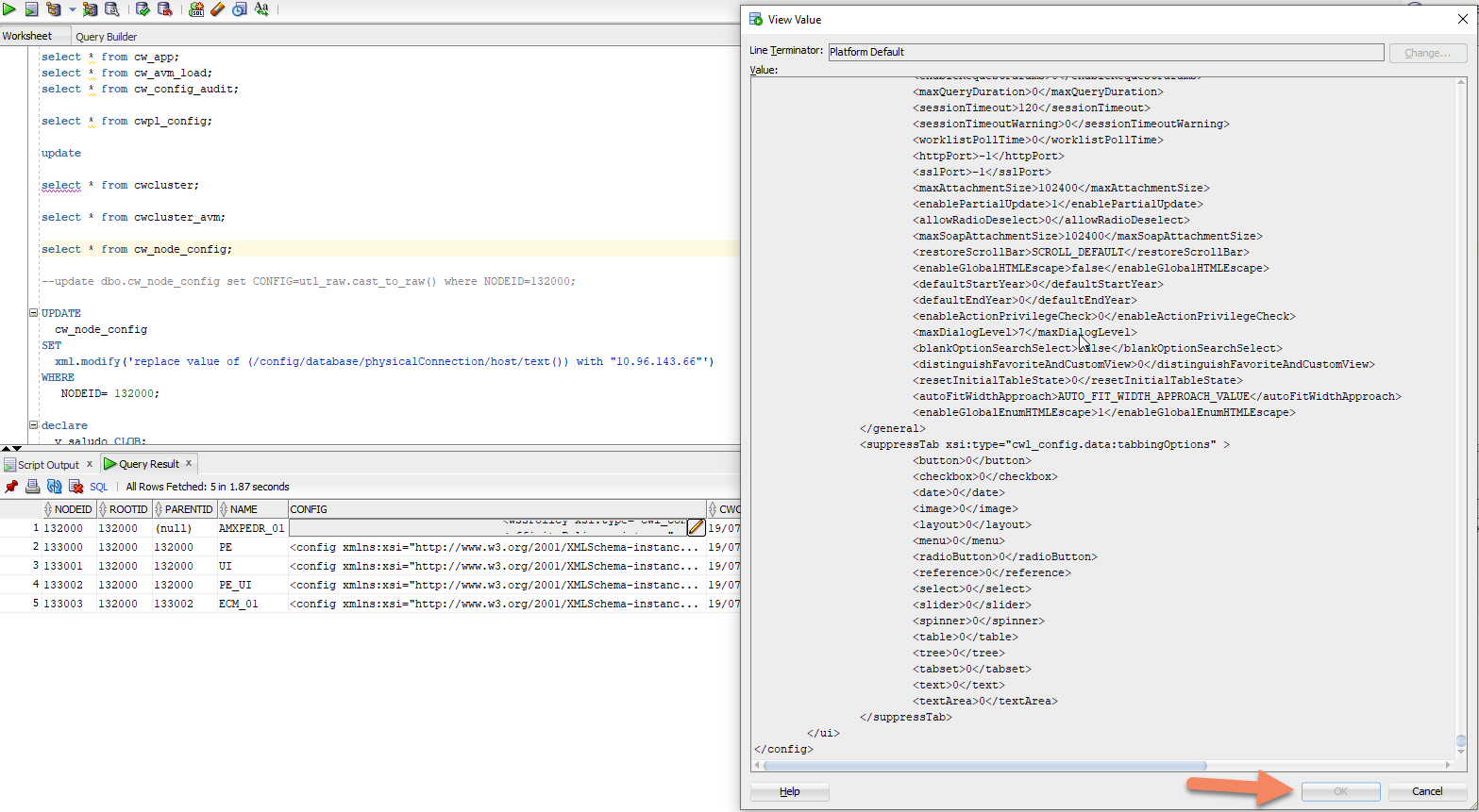 屏幕截图的左边显示您执行了SELECT语句,这会导致一些行。CONFIG (那是CLOB,对吗?)不能将它包含的所有数据都显示在一行中,所以您可以选择单击铅笔按钮--这就是您所做的,就像屏幕截图的右侧显示的那样。