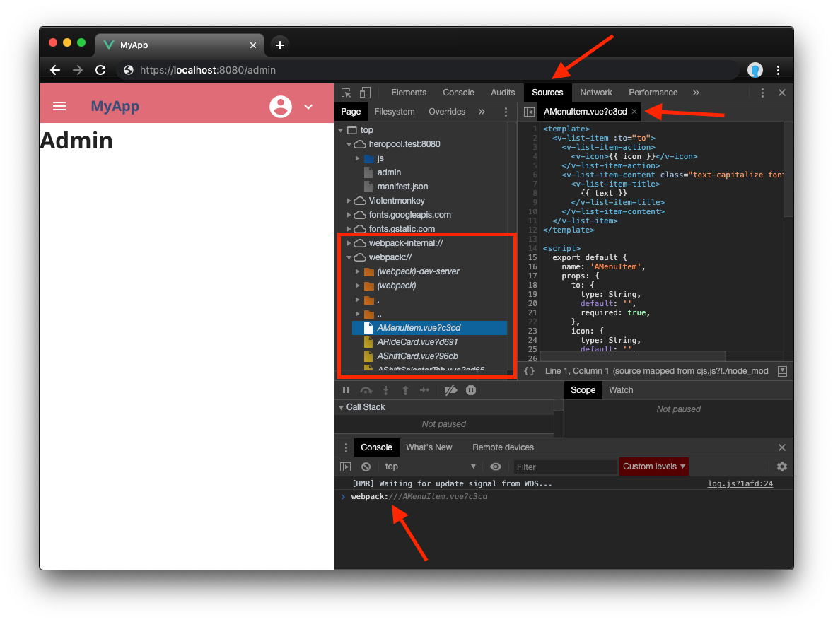当您使用内置的webpack开发服务器(即通过命令行运行vue run serve )运行VueJs应用程序时,当您试图在浏览器中查看其中一个文件的源时(如在屏幕截图中),webpack将这些文件的源代码提供给您的浏览器,它们倾向于使用webpack:/// URL方案。