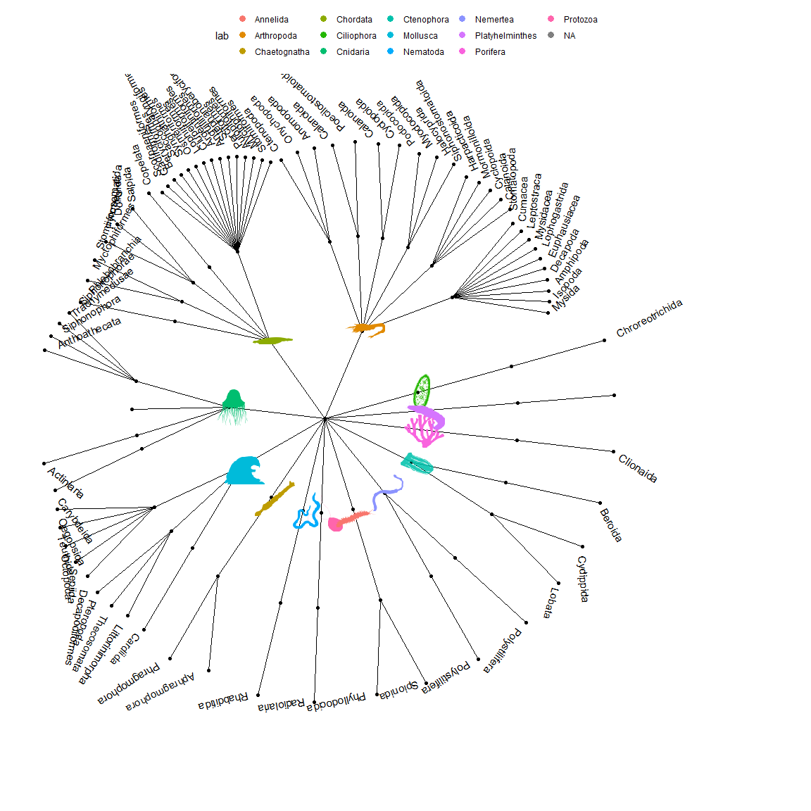 lab = c("Arthropoda", "Chordata" , "Cnidaria" , "Mollusca" , "Chaetognatha" , "Nematoda" , "Protozoa", "Annelida" , "Nemertea" , "Ctenophora" , "Porifera" , "Platyhelminthes", "Ciliophora" ),
