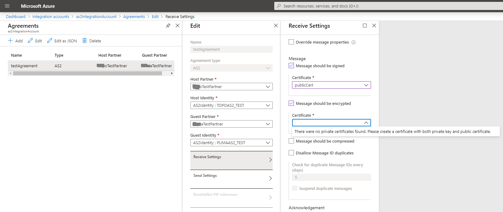 目前,我正在Azure上建立一个集成帐户。在定义协议时,我希望消息既有签名又有加密,但我不能提供私人证书,因为我一直收到这条消息。