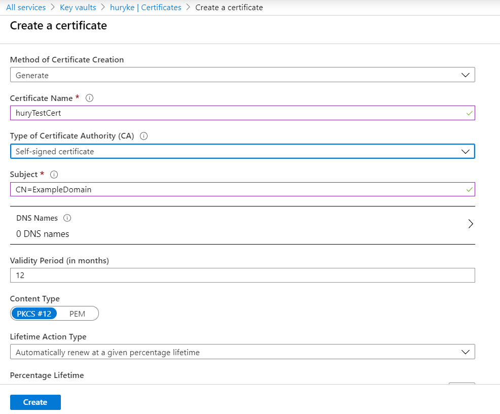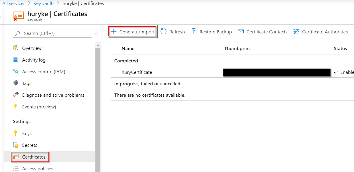 我去我的天蓝色密钥库,并点击“证书”->“生成/导入”。