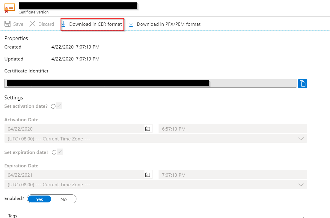看来你的证书不符合要求。我通过在蔚蓝密钥库中创建证书来测试它,它运行得很好。