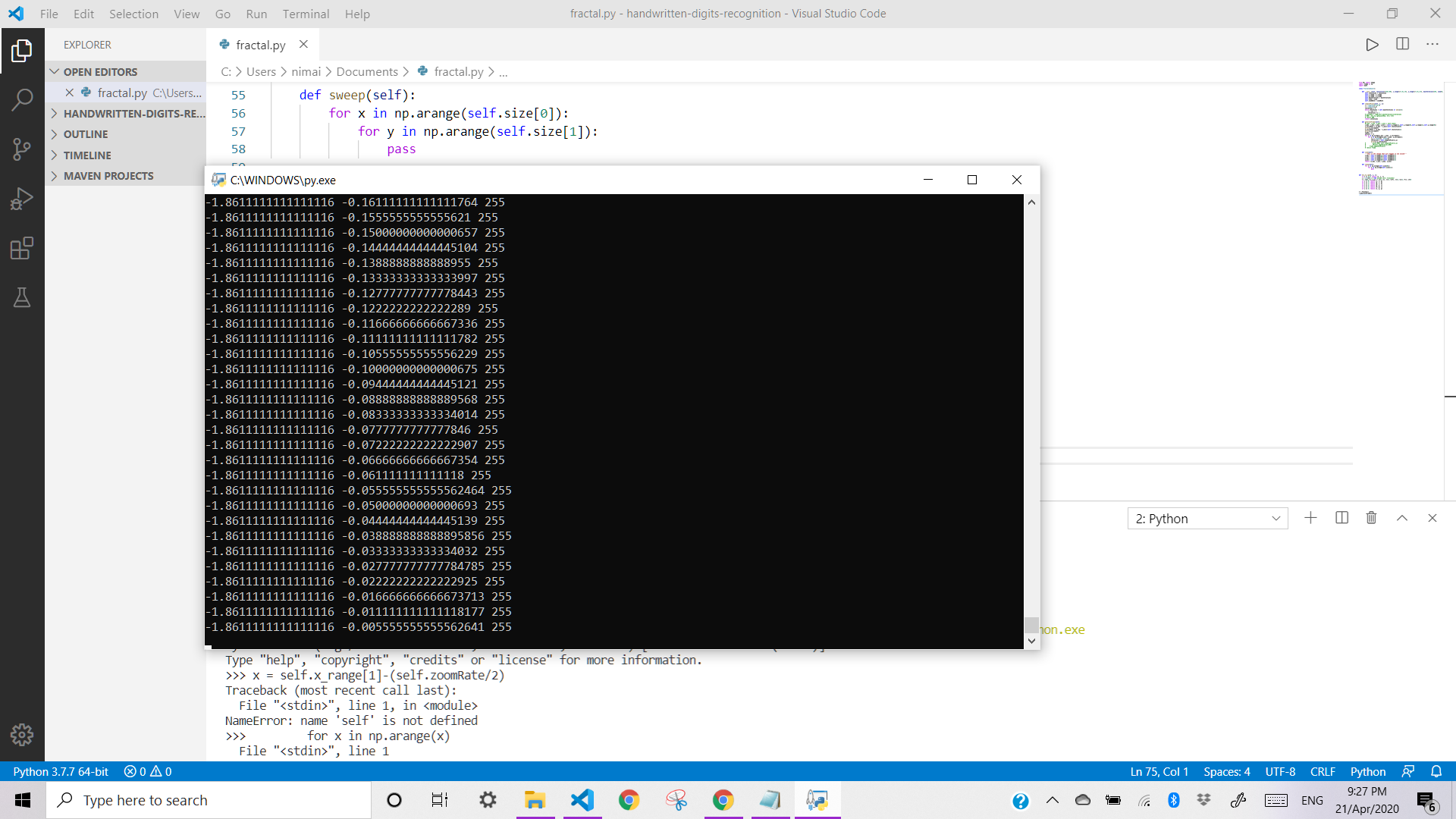 这是命令行的最后一个屏幕截图,我将打印所有复数的实部和虚部,并给出该数收敛所需的迭代次数(如果输出为255)。