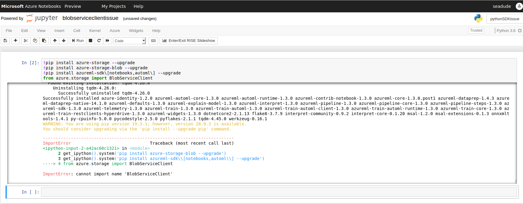 不幸的是,当我试图调用ImportError: cannot import name 'BlobServiceClient'时,我得到了错误:from azure.storage import BlobServiceClient。这发生在安装和升级azure-storage (v0.36.0)和azure-blob-storage (v12.3.0)之后。