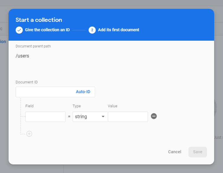 });我想弄清楚他们想让DB看起来像什么样子。我用的是火底云火药库。据我所知,我需要创建一个名为users的集合,这就是我所做的。然后我来到了下面的窗口: