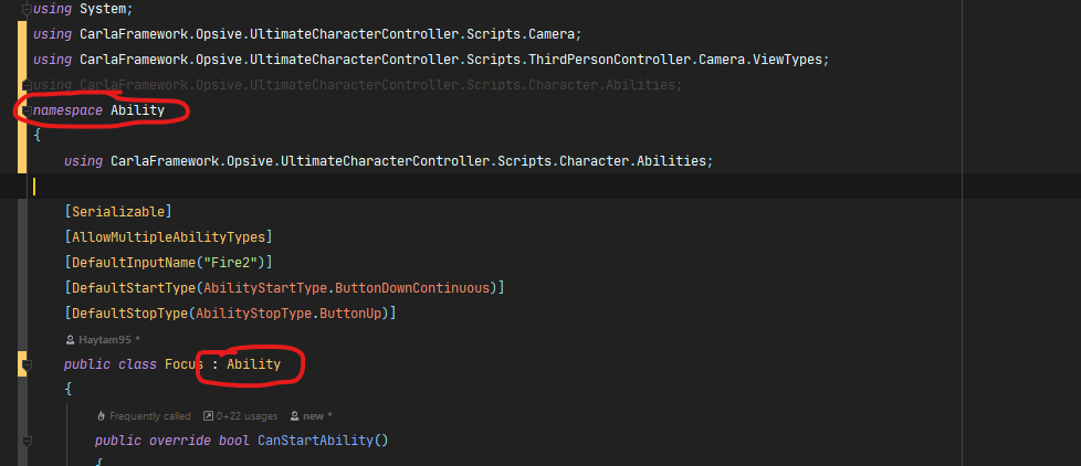 protected CarlaFramework.Opsive.UltimateCharacterController.Scripts.Character.Abilities.Ability currentAbility;只要重命名名称空间,问题就解决了。