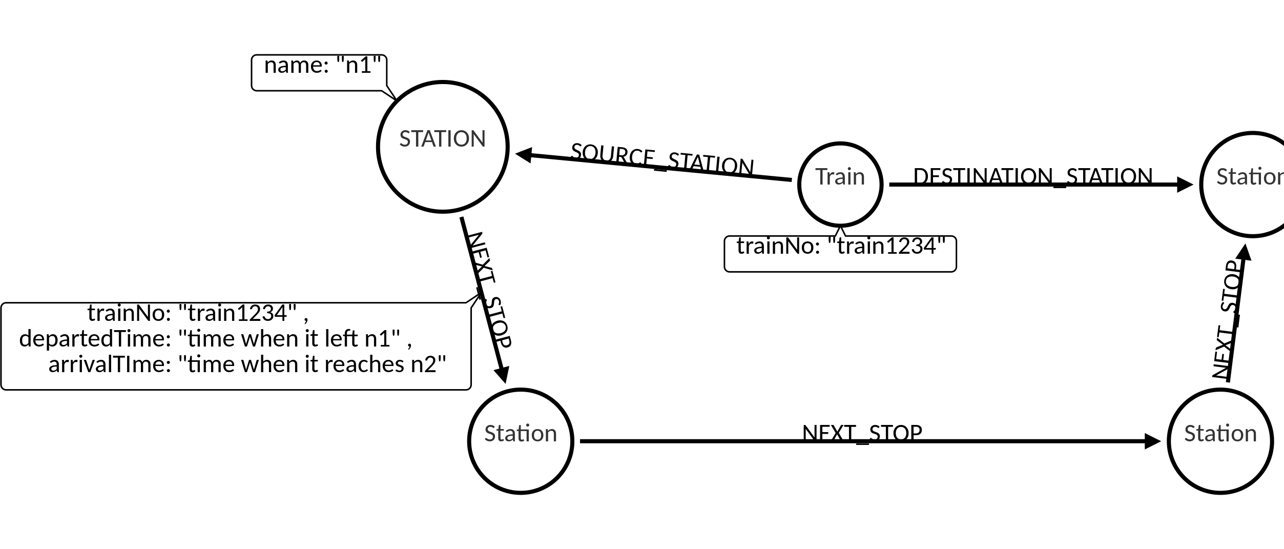 您可以使用这样的结构来表示数据。火车到源和目的地是可选的,.That只会帮助你找到在源和目的地之间的列车数量。如果在两个车站之间有多列火车,你需要有多个关系,每列火车有一个。