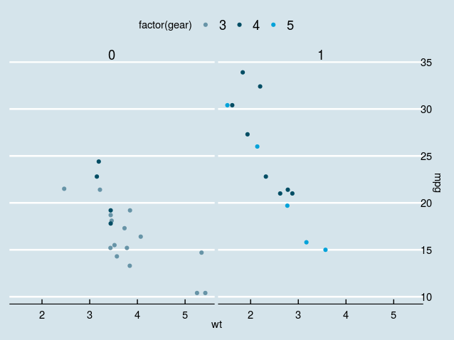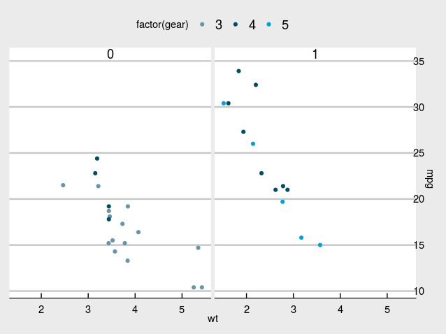 geom_point(aes(x = wt, y = mpg, colour = factor(gear))) +