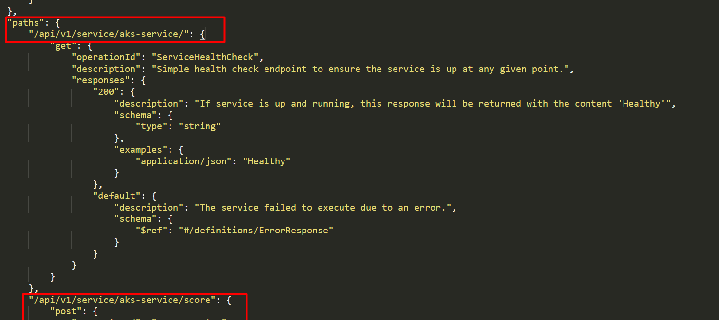 我比较了AKS集群的swagger.json文件和ACI容器实例的文件。而这两个文件之间的区别是关键的“路径”。在AKS中,swagger.json中的路径是:“path”:{“/api/v1/service/aks-service/”:.在ACI中,swagger.json中的路径是:“path”:{ "/":....etc