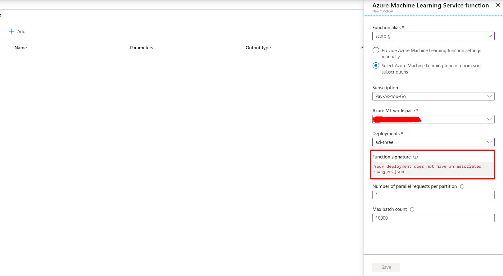 我正试图在工作服务中创建一个Azure服务功能。为此,我在Azure容器实例(即ACI)中使用已经部署的ml模型。但是,我得到了以下错误: