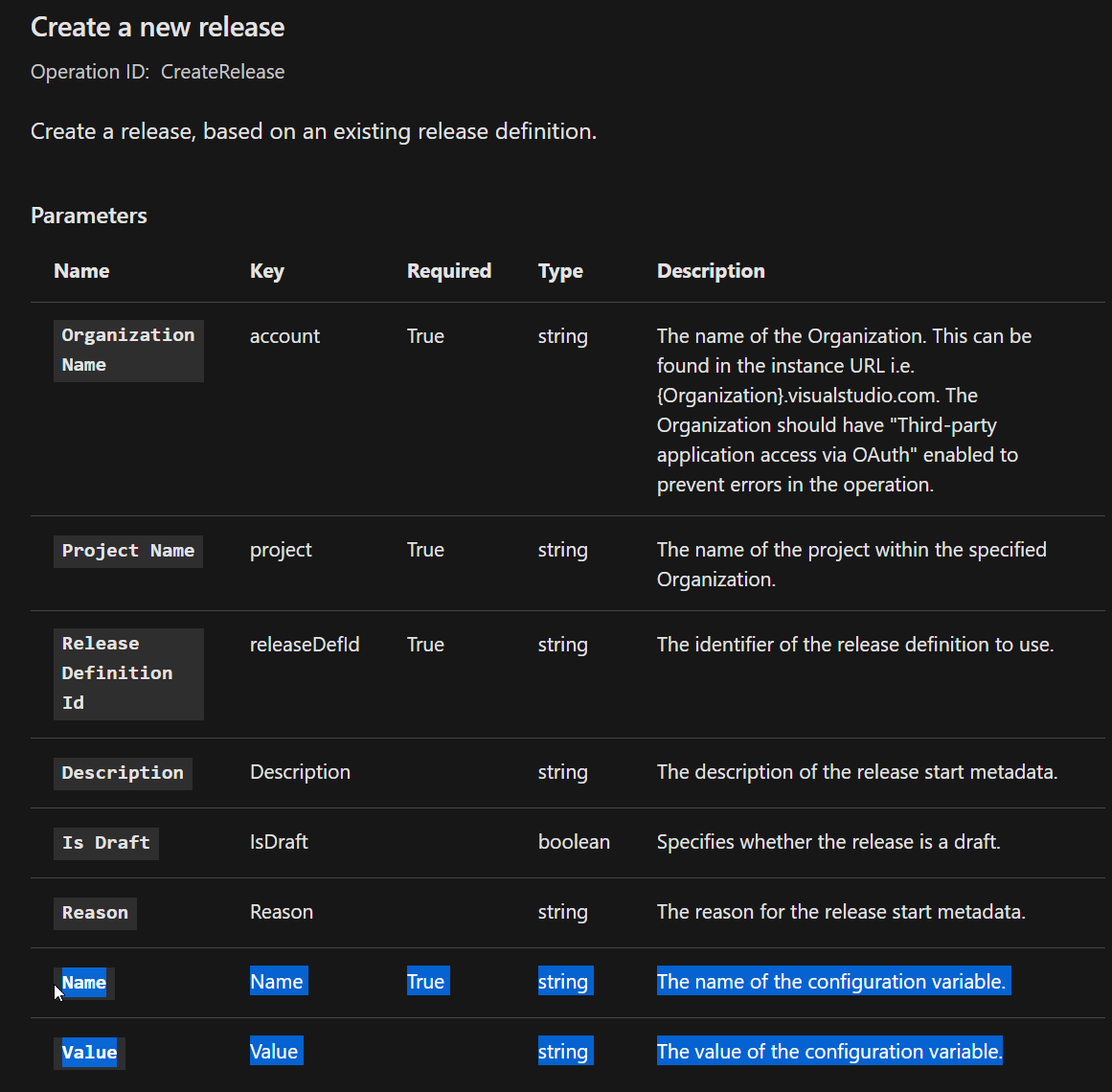 并查看蔚蓝DevOps连接器doc https://learn.microsoft.com/en-us/connectors/visualstudioteamservices/#create-a-new-release。