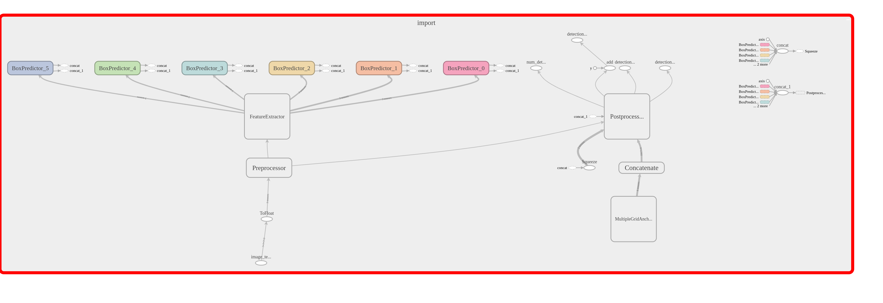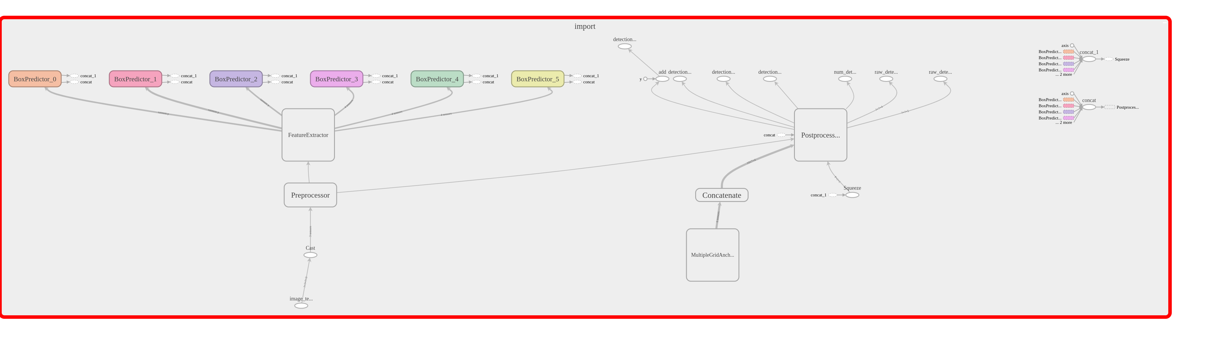 在图像的最右端可以看到节点交换。在预先训练的图表中,Postprocess layer与concat_1连接,Squeeeze与concat连接.但经过训练后,图表显示完全相反。就像Prosprocess layer和concat连接,Squeeeze连接concat_1。此外,我还在预先训练过的模型图中发现,Preprocessor接受输入ToFloat,而在训练之后,图形显示为Preprocessor的输入。我已经把输入作为tfrecords输入到模型中。