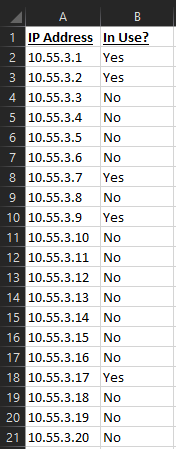 我会输入所有IP地址到一个单独的‘助手’范围与2列。第一列将具有IP地址,第二列将具有、Yes、或无值。我会使用索引和匹配的组合来动态填充第二列(下面将解释)。