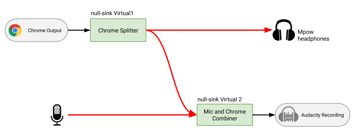 我听Youtube的卡拉OK歌曲,我的耳机上有铬,我沿着麦克风唱歌。现在,我希望同时记录耳机输出和麦克风输入的大胆.