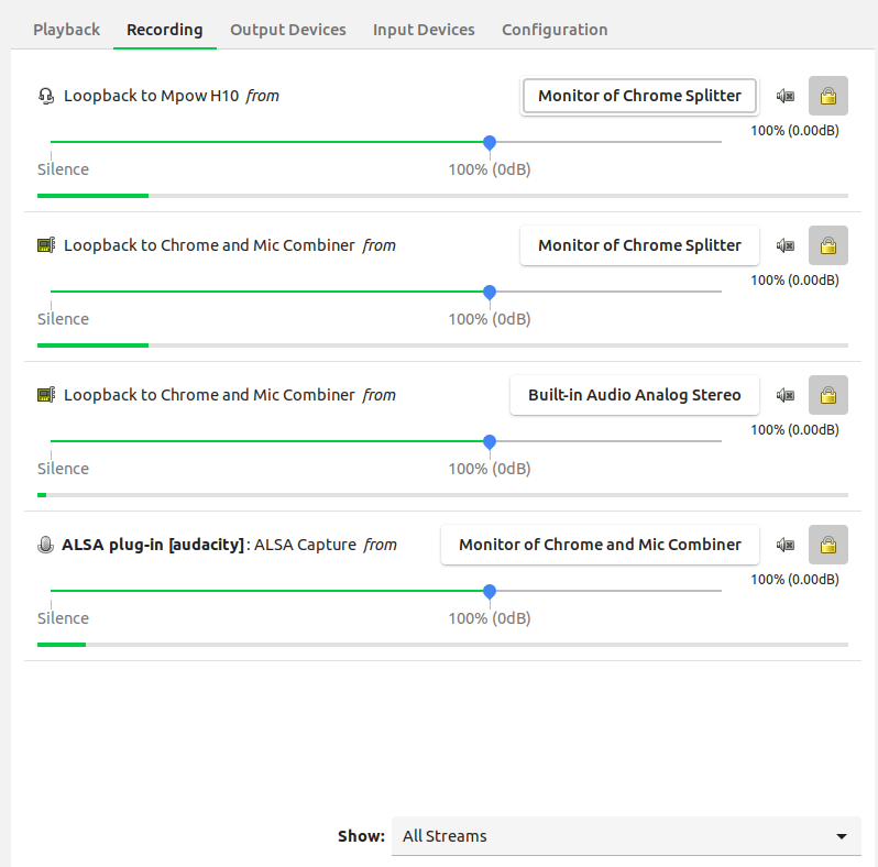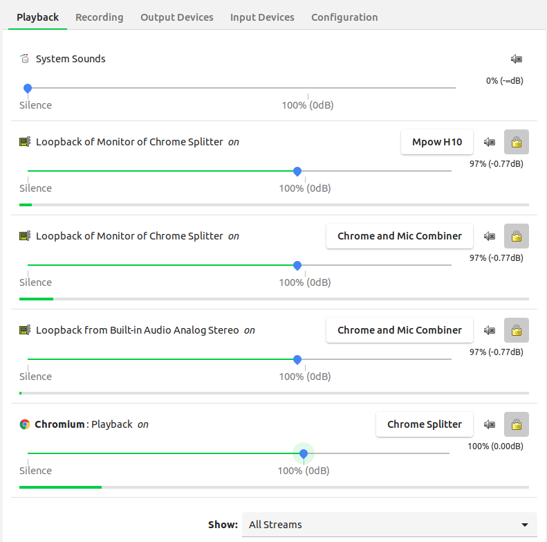pactl load-module module-loopback注意,接收器名称和描述可以是您想要的任何内容。描述将出现在pavucontrol中,使配置变得更容易一些。