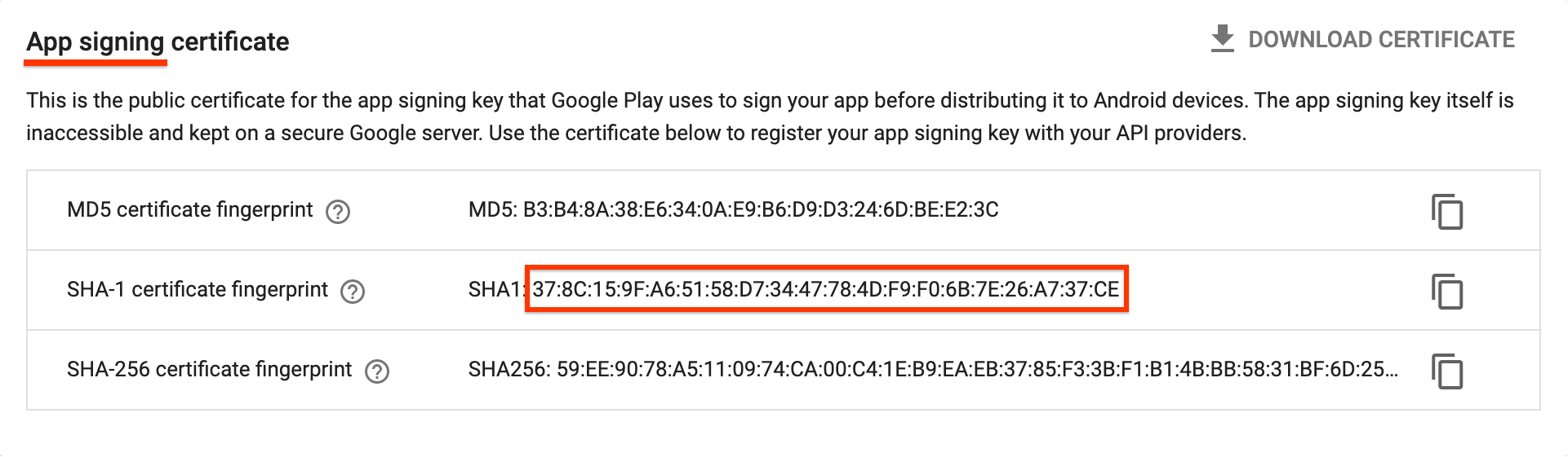 必须确保google提供的应用程序签名证书与我所提供的相匹配。