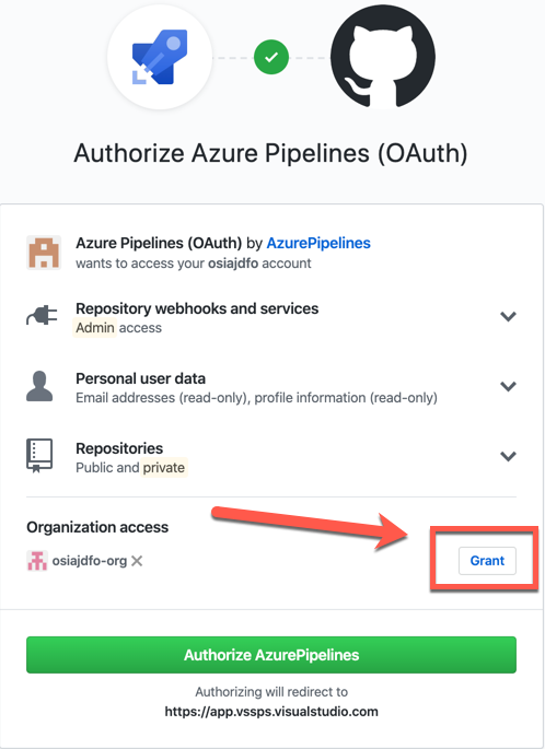 其次,在安装过程中,您会被带到Azure DevOps来安装您的项目。将显示两个不同的授权页面;“Microsoft的Azure管道希望.”以及用于OAuth授权的页面。如下图所示,有一个很容易被忽略的小授予按钮。在按大绿色表示“授权AzurePipelines”之前,您需要按下该按钮。