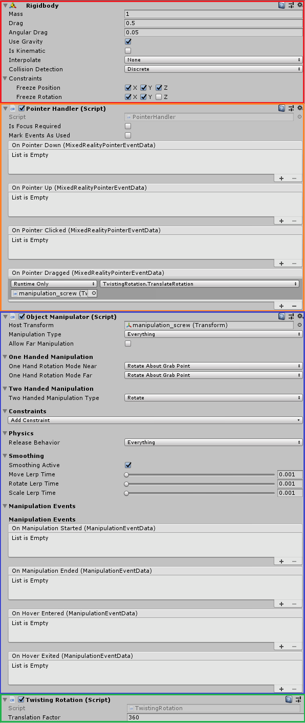 刚体、PointerHandler.cs、ObjectManipulator.cs和TwistingRotation.cs配置可以在这里找到: