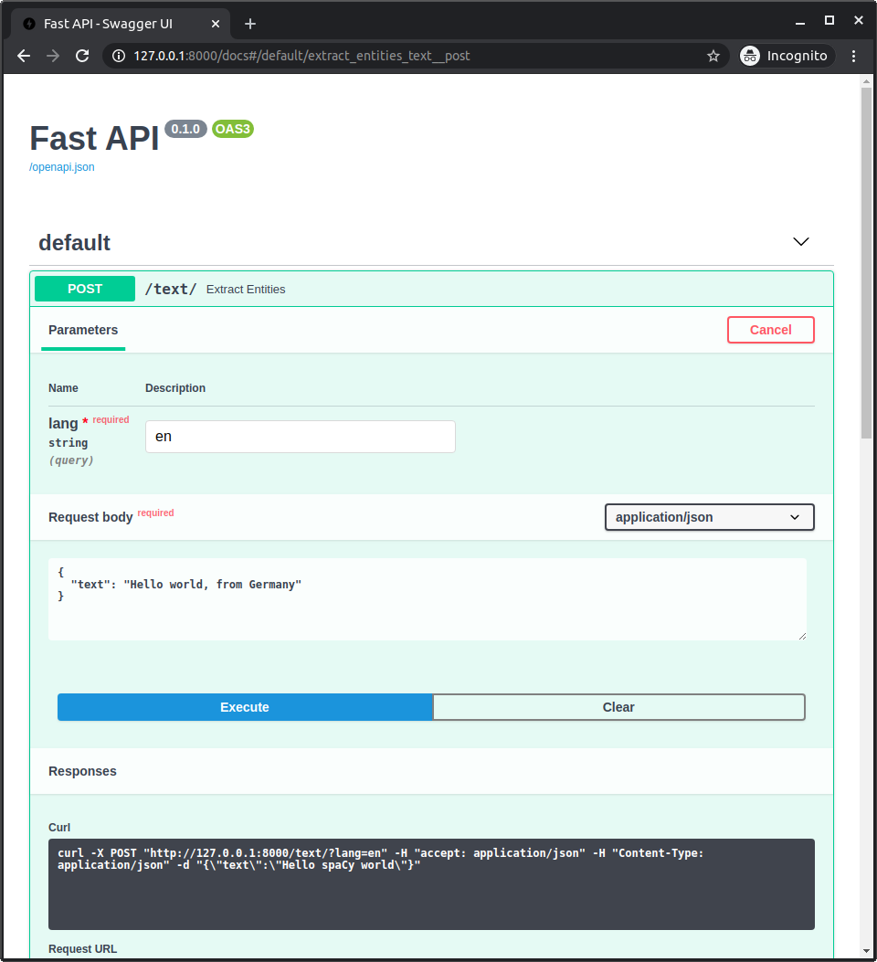 return {"message": data.text, "lang": lang, "ents": ents}自动docs如下所示: