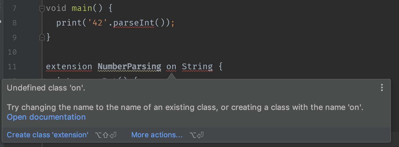 }它显示了它下面的一条红线,当我在上面盘旋时,它说:Undefined class 'on'.。因此,它也不能识别on之后的接收方on,在我的例子中是String。