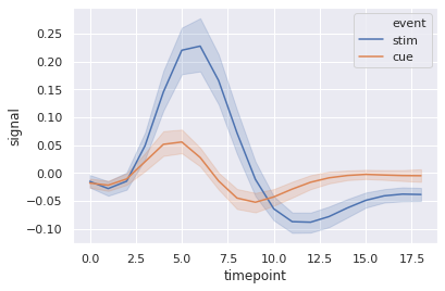 ax = sns.lineplot(x="timepoint", y="signal", hue="event", data=fmri)产生了这个图表:
