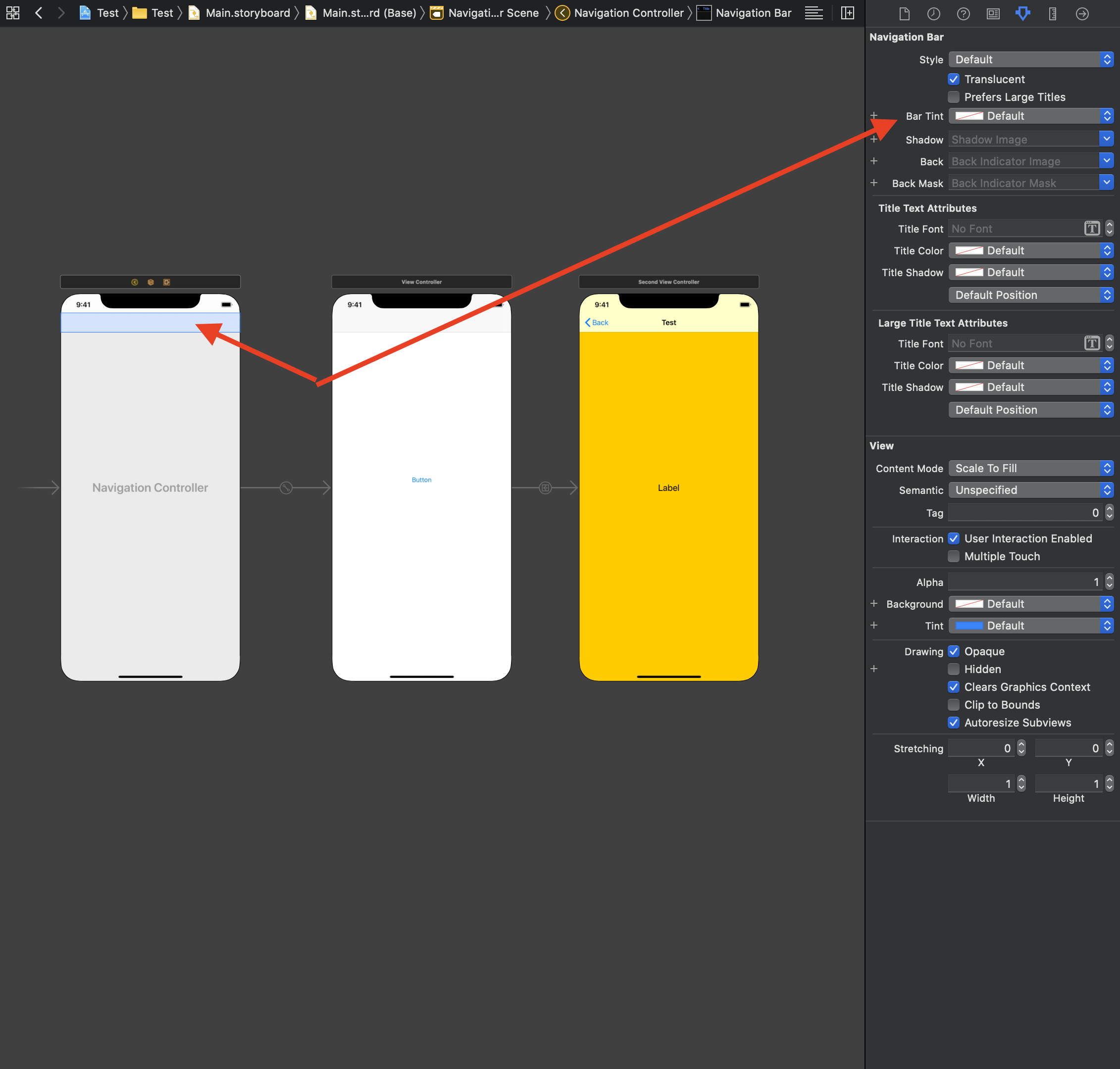 在故事板上,因为您的导航控制器将"Bar Tint“更改为”默认值“,然后在代码中您可以像往常一样更改它。